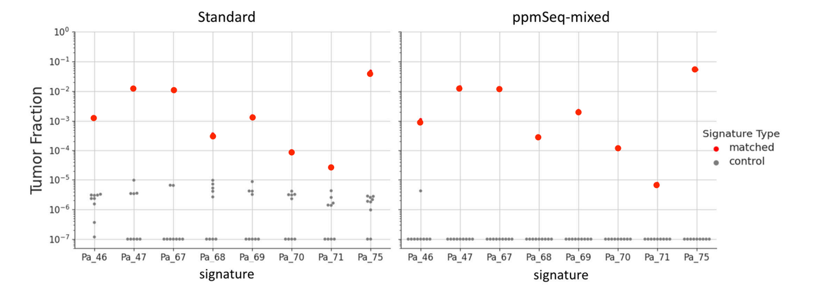 Estimated tumor fraction in matched and control cfDNA samples, for standard cfDNA prep (left) and ppmSeq-mixed (right). Each column corresponds to one patient SNV profile, with one matched cfDNA sample and 9 negative control samples. Included are reads that exceed the quality thresholds of SNVQ60 for Standard, and SNVQ70 for ppmSeq-mixed.