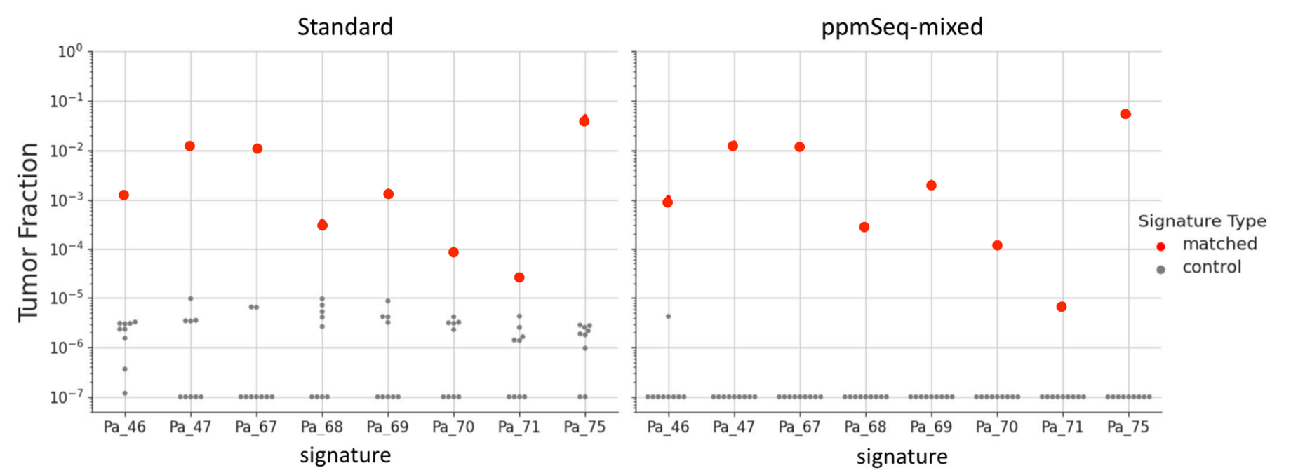 Estimated tumor fraction in matched and control cfDNA samples, for standard cfDNA prep (left) and ppmSeq-mixed (right). Each column corresponds to one patient SNV profile, with one matched cfDNA sample and 9 negative control samples. Included are reads that exceed the quality thresholds of SNVQ60 for Standard, and SNVQ70 for ppmSeq-mixed.