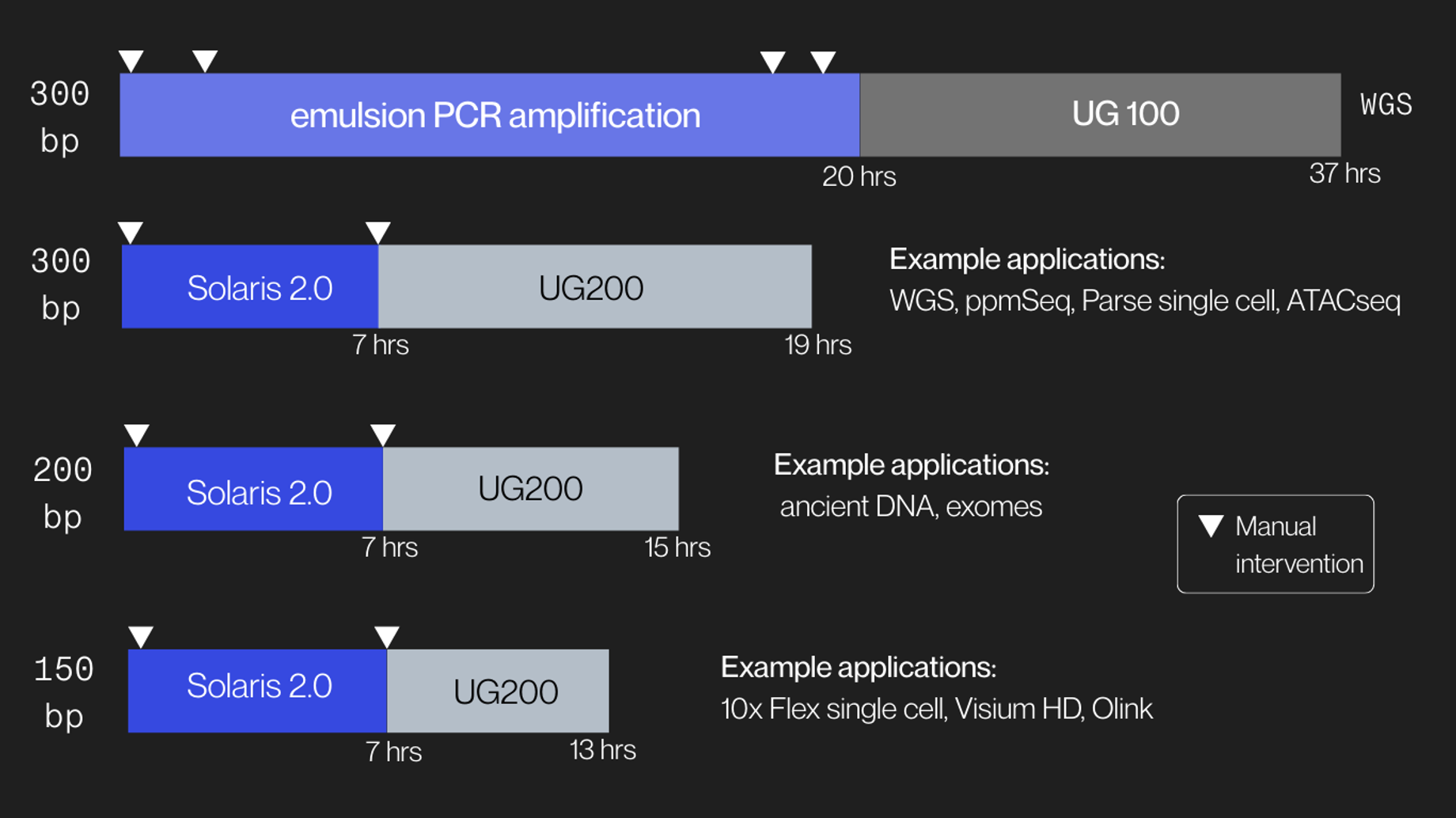Solaris 2.0 provides a simplified 7-hour amplification workflow with hands-on time of only 10 minutes with one touch point. When using UG200 Series sequencers, libraries can be amplified and sequenced in 13 to 19 hours total depending on the sequencing read length.